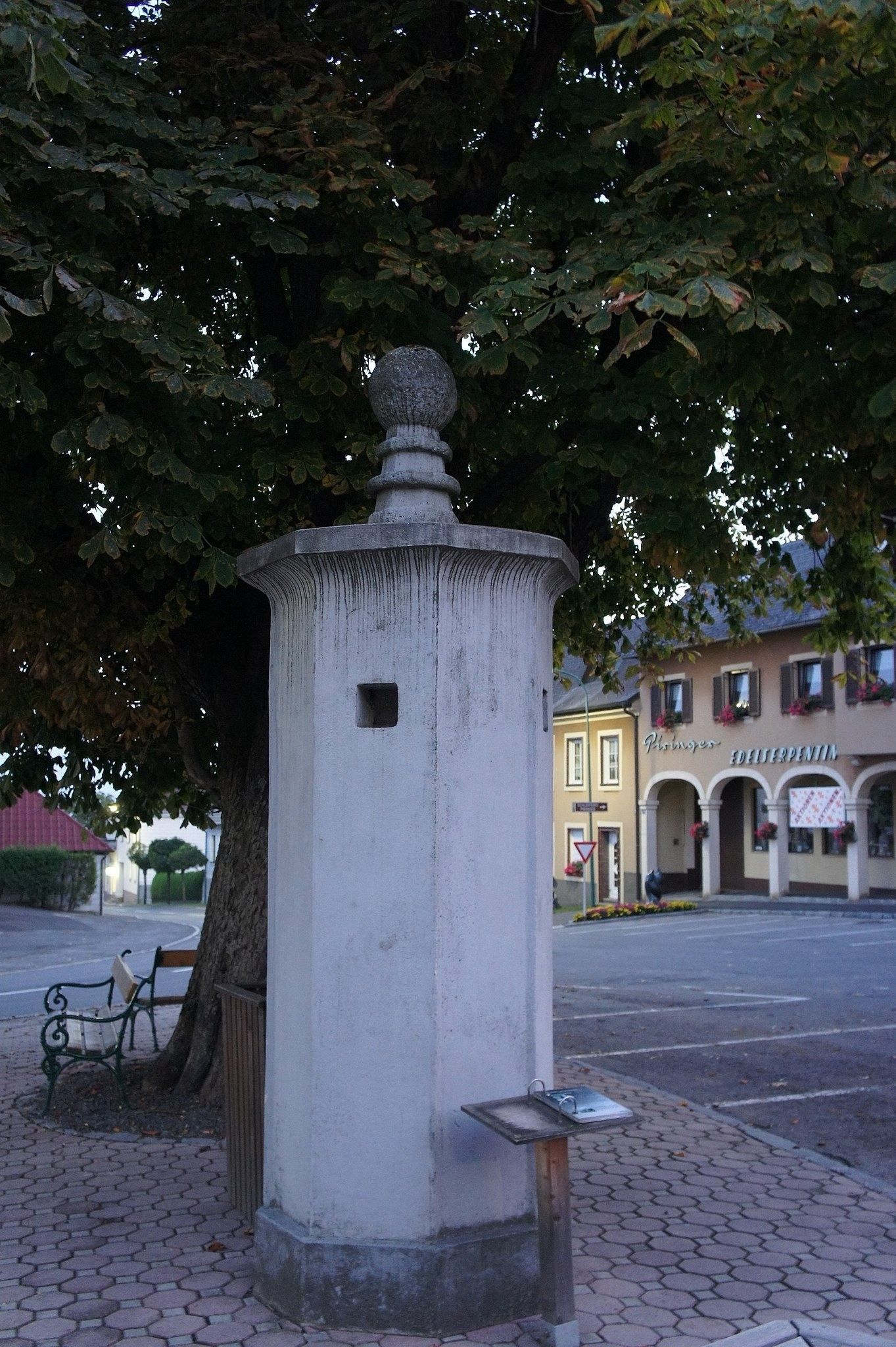 Achteckiger barocker Pfeiler in der Mitte des Hauptplatzes.